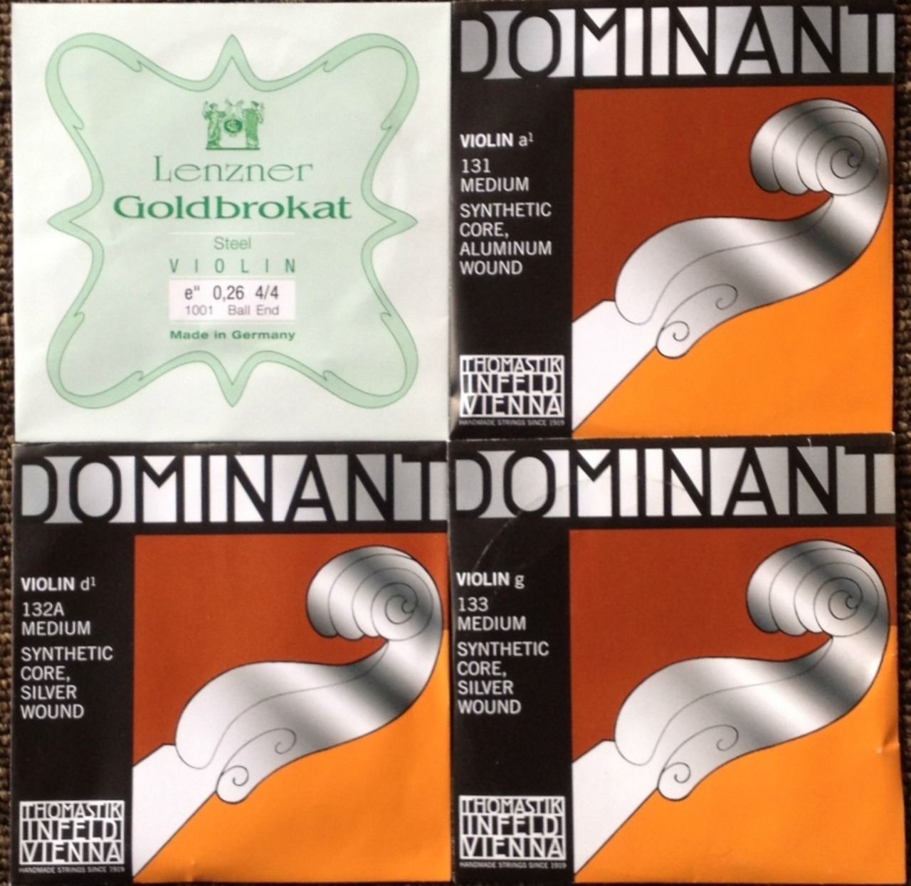 バイオリン弦4弦セット ドミナント+ゴールドブロカット E線=Goldbrokat ADG線=Dominant【A(131)/D(132A)Silver/G(133)】